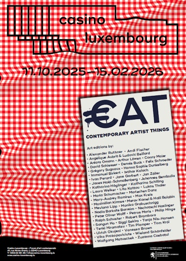 €AT has been conceived of as an allegory of a dinner party, where creation and accessibility meet. Thw exhibition brings together the work of about fifty international artists in a large catalogue of limited-edition artworks available for purchase at discount prices. The artworks can be bought simply by asking at the Casino Luxembourg front desk. The artists will receive the entire listed amount, while also contributing to the running of the online art platform.